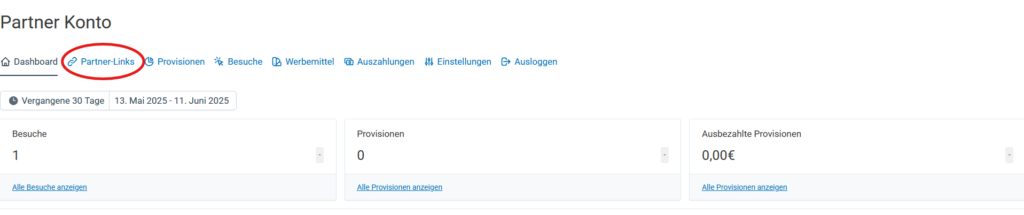 3. Nun kannst du dich in dein Partnerkonto einloggen, wo du z.B. sehen kannst, welche Provisionen dir schon zustehen. Klicke hier auf Partner-Links